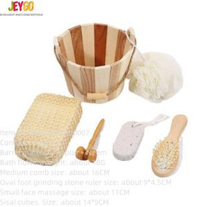 Contains Products: Wooden bucket, bath flower, scrub pad, pumice stone, face brush, massage tool
