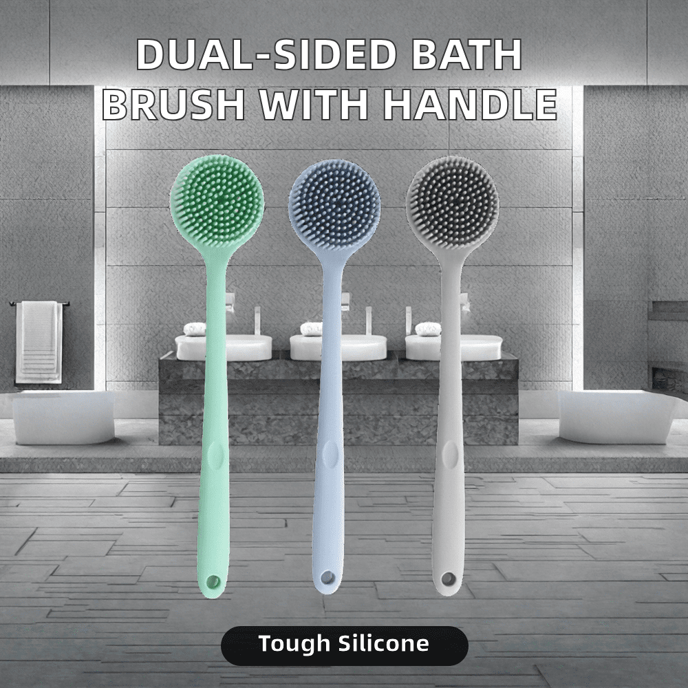 Double-sided bath brush with long handle, featuring exfoliating and massaging silicone bristles, for shower cleaning.