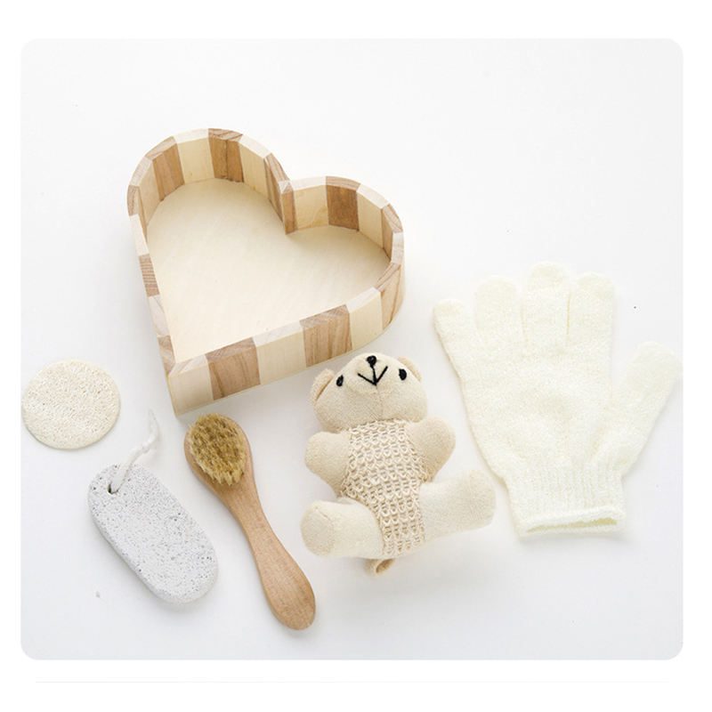 Contains Products: Wooden box, towel bear, loofah, face brush, pumice stone, bath accessory