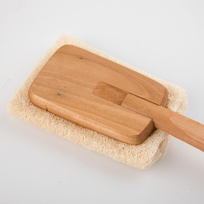 This exfoliating loofah sponge features a solid wooden handle combined with a natural loofah head, designed for effective back and body exfoliation. The loofah texture helps lift dead skin while remaining comfortable for regular use, making it suitable as a spa back scrubber for both home bathing routines and professional spa environments. The extended handle improves reach and control, especially for the back and lower body.
