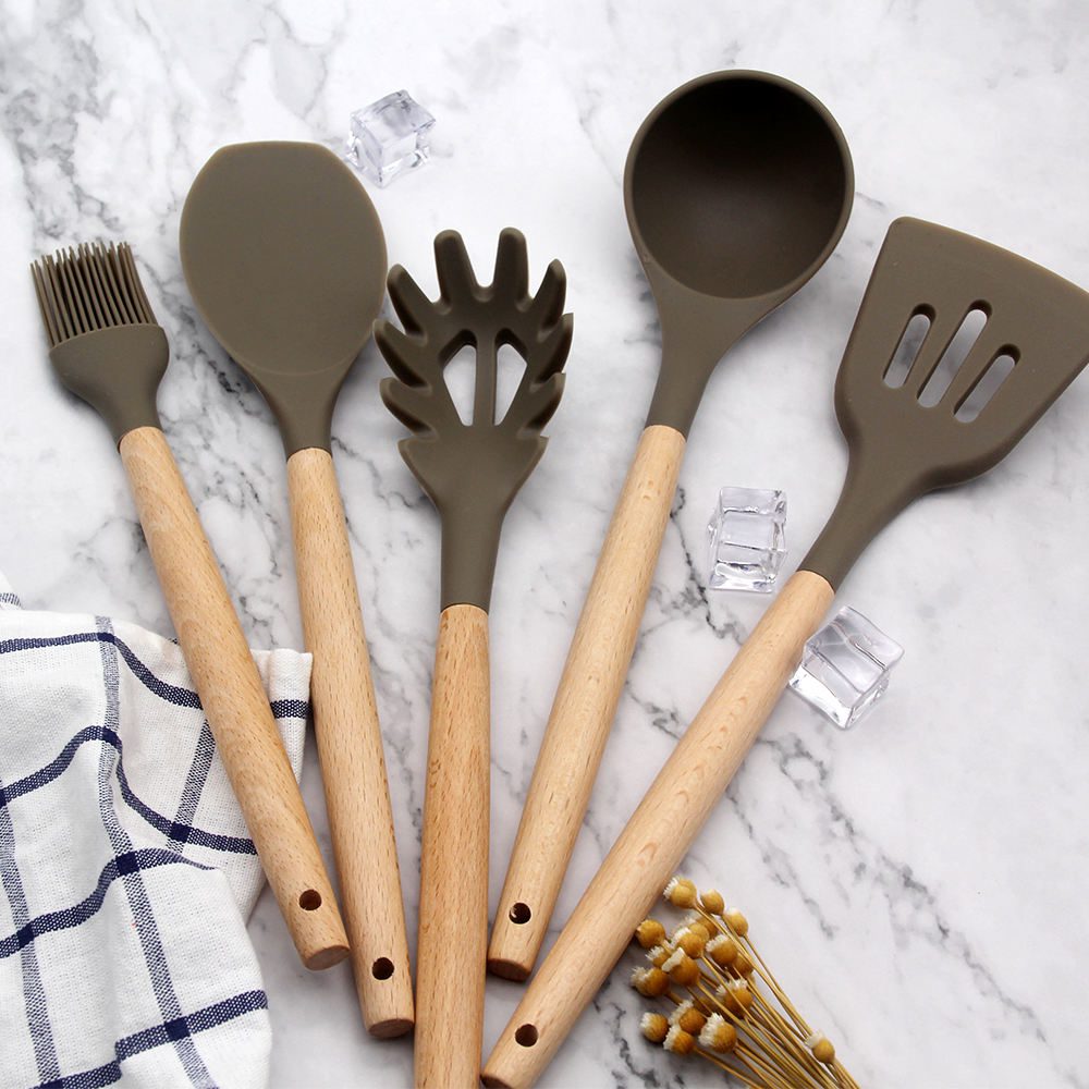 silicone kitchen accessories, household and kitchen non stick cookware set, and popular large silicone wooden spoons are selling well.