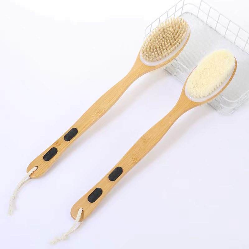 Double-sided wooden body scrub shower brush with long handle and soft/hard bristles, suitable for back and body